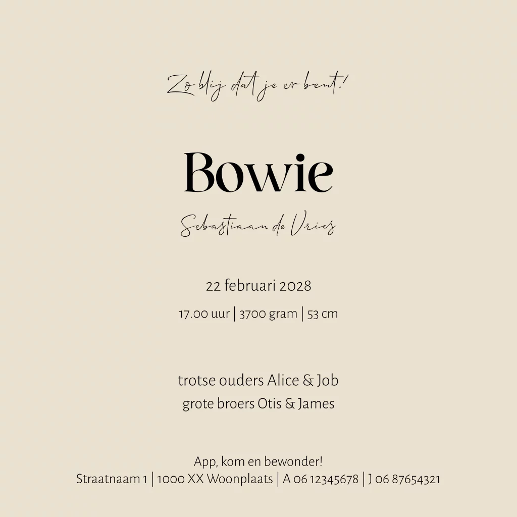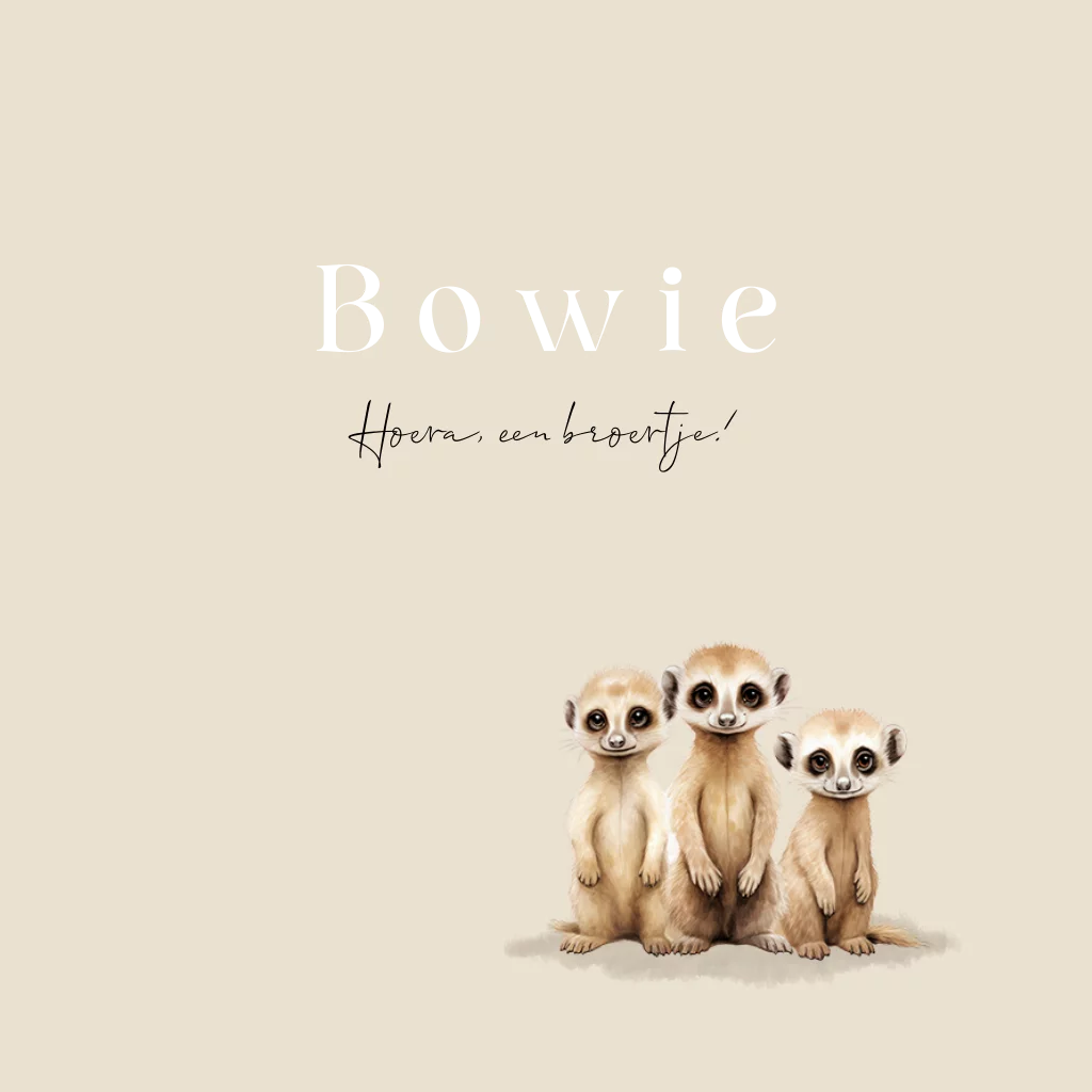 Geboortekaartje voor een broertje, derde kindje. Op de voorzijde een illustratie van drie schattige stokstaartjes. Aan de binnenzijde steelt het kleine baby stokstaartje de show!