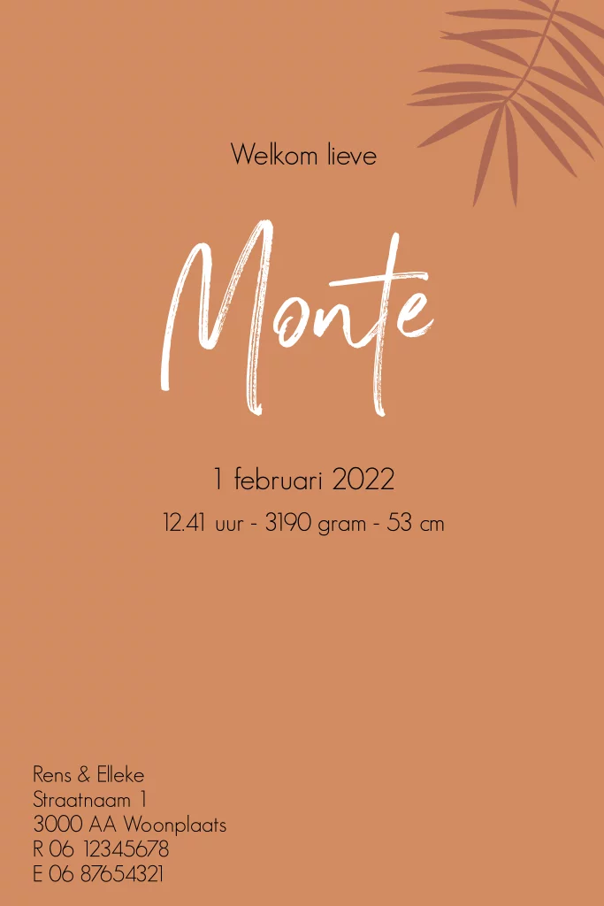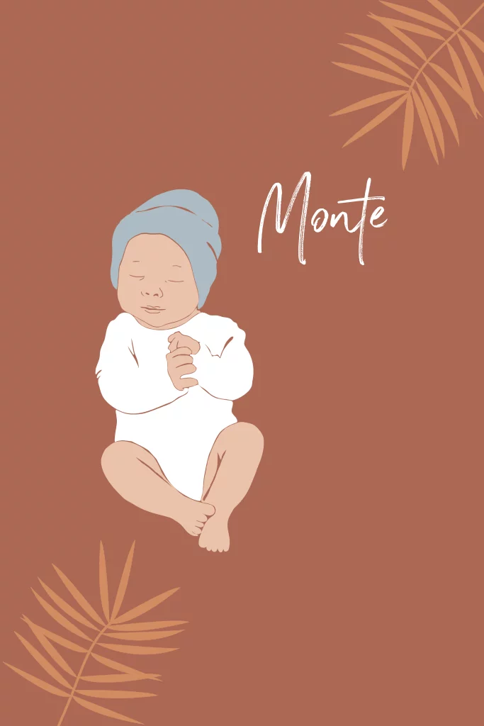 Hip geboortekaartje voor een jongen in stoere aardetinten. Illustratie van baby jongen met hip mutsje omringd door palmbladen. Andere varianten van de baby zijn terug te vinden in de beeldbank.