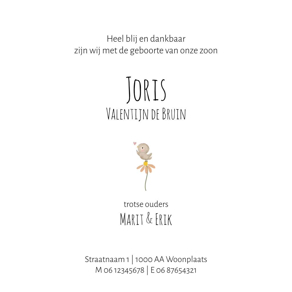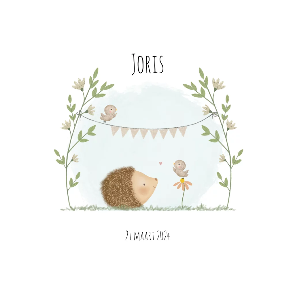 Lief geboortekaartje voor een jongen met handgetekende illustratie van een lief egeltje en vrolijke vogeltjes. Ook op de binnenzijde van de kaart spelen deze figuurtjes een rol! Natuurlijk kun je dit ontwerp helemaal naar eigen wens aanpassen. - Joris -