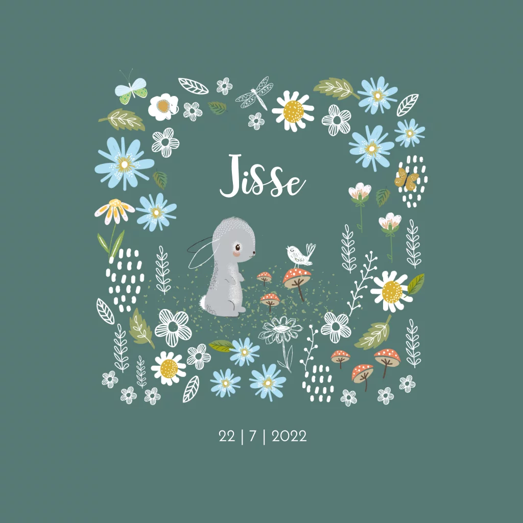 Een heel lief geboortekaartje voor een jongen met klein konijntje omringd door bloemen, takjes en paddenstoelen. Op één van de paddenstoelen zit een klein wit vogeltje die het konijntje vrolijk toefluit. Het tafereeltje komt mooi uit op de donkergroene achtergrond. Op de binnen- en achterzijde van de kaart komen ook de takjes en paddenstoelen weer terug.