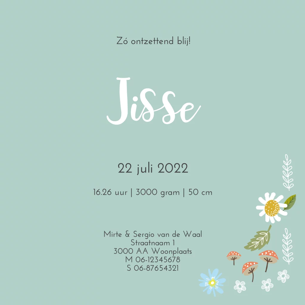 Geboortekaartje jongen met konijn bloemen en paddenstoelen