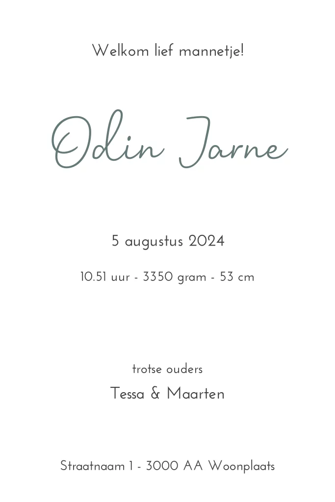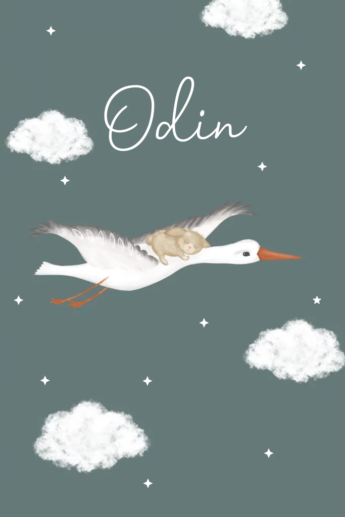 Lief geboortekaartje voor een jongen, met op een mooie grijsgroene achtergrond een illustratie van een ooievaar met op zijn rug een slapend konijntje. De naam en de sterretjes zijn in goudfolie en geven dit kaartje een sprookjesachtig tintje. - Odin -