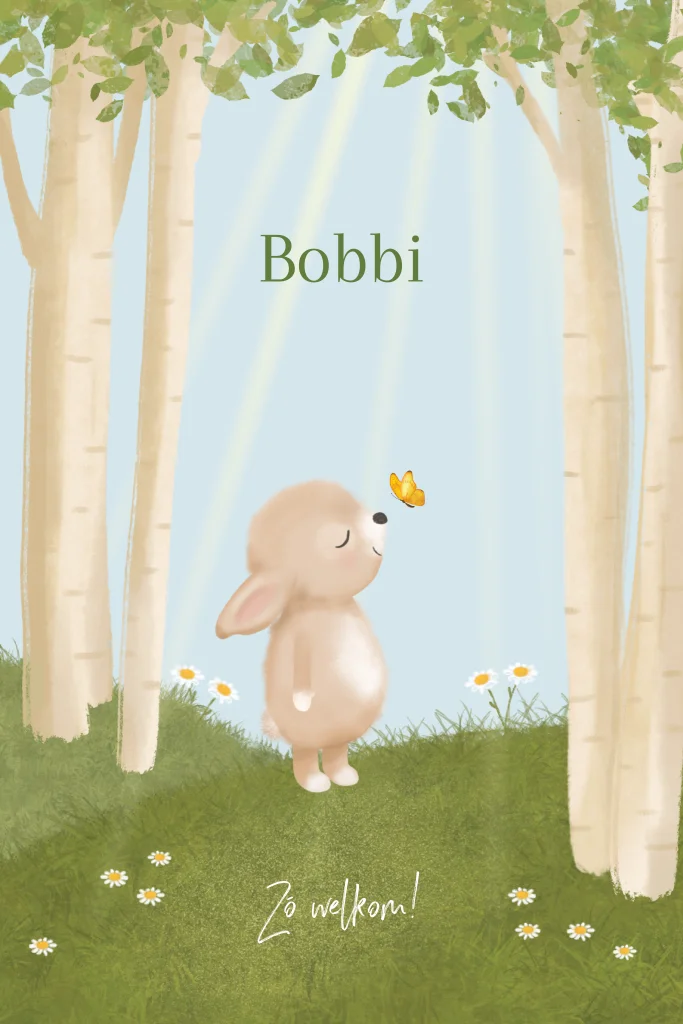 Lief geboortekaartje met een konijntje in het bos omringd door zachte zonnestralen. Leuk voor zowel voor een jongen als een meisje! - Bobbi -