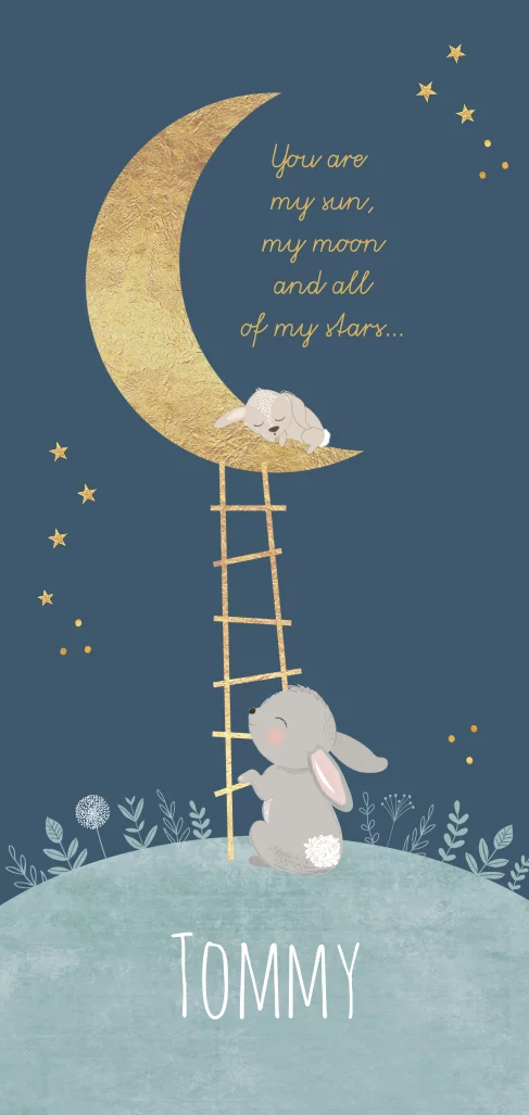 Lief geboortekaartje voor een jongen met gouden maan waar een klein konijntje in ligt te slapen. Het andere konijntje klimt via het trapje naar boven.