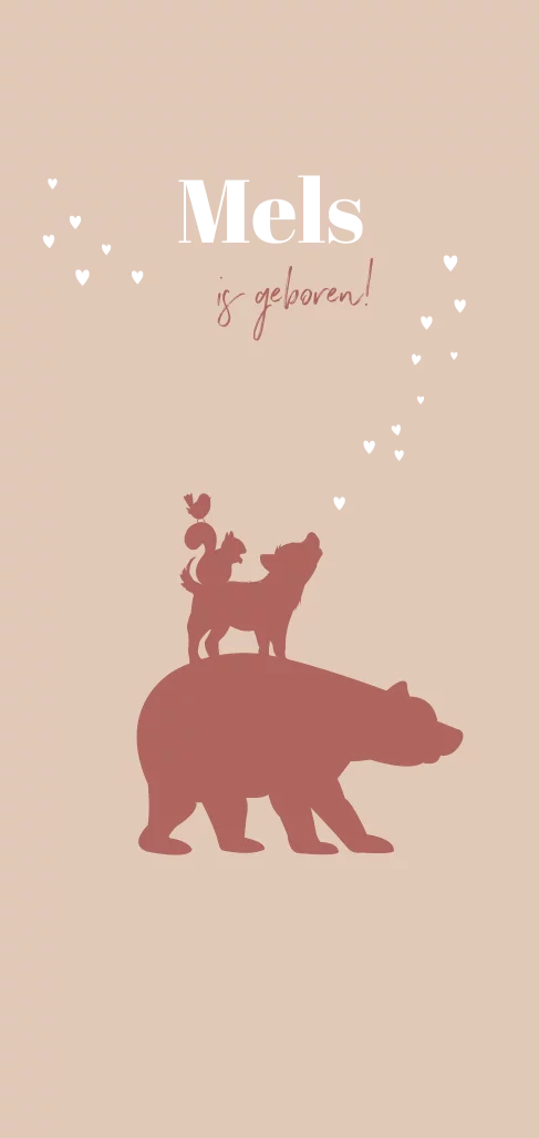 Geboortekaartje met folie voor een jongen. Zandkleurige achtergrond met daarop een verzameling bosdieren die op elkaar gestapeld staan. De naam en de sprankelende hartjes in goudfolie geven dit kaartje een extra feestelijk accent!