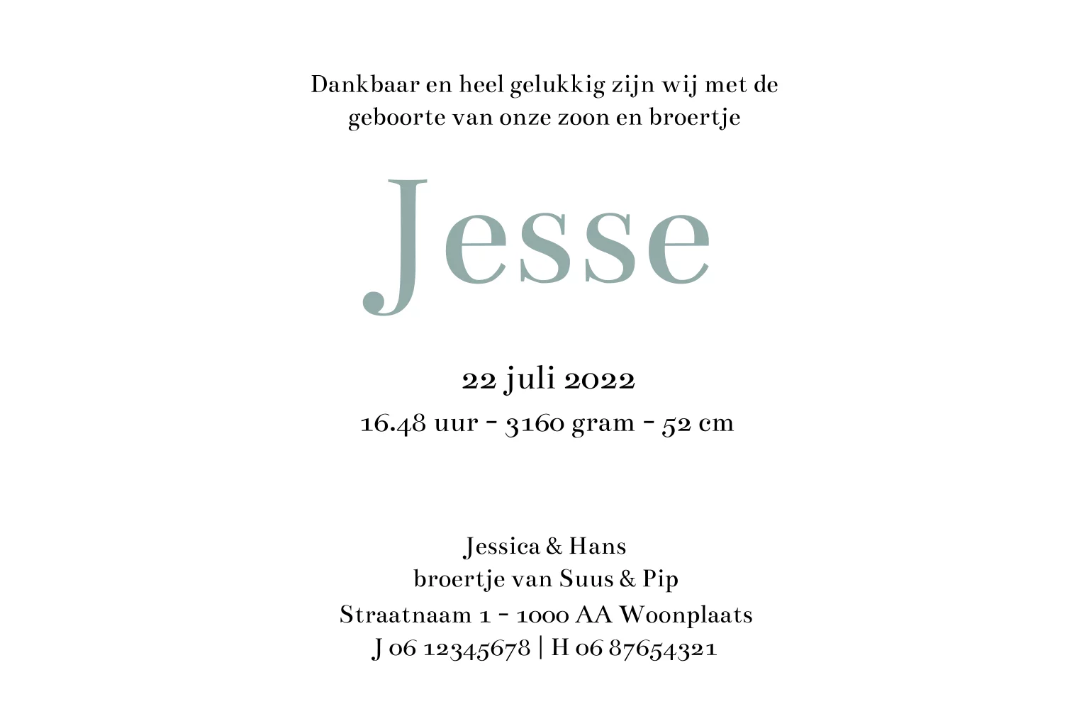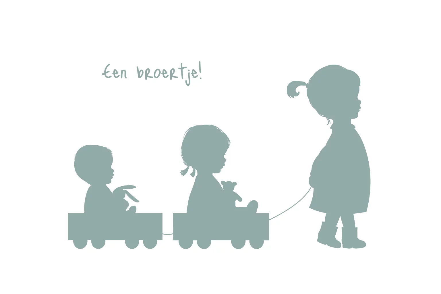 Lief geboortekaartje met silhouet in groene tint van twee zusjes en het kleine broertje in een wagentje. De kleur van de silhouetten en de tekst kun je zelf naar wens aanpassen.