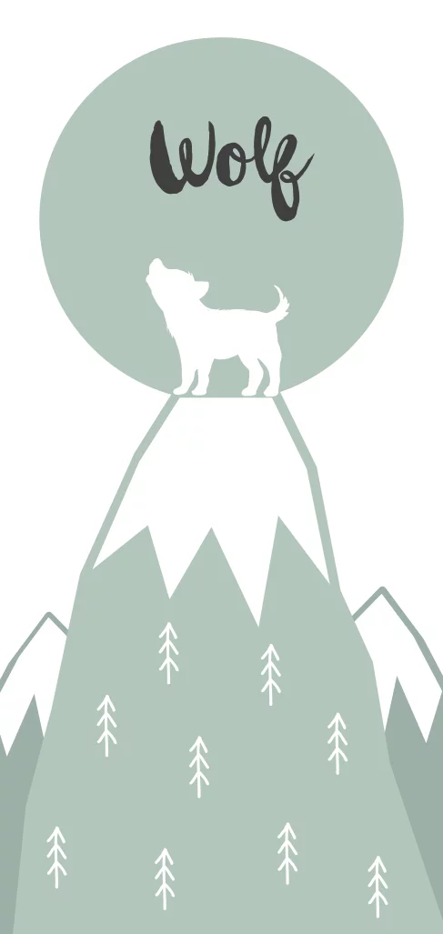 Stoer geboortekaartje in mooie groentinten met kleine wolf op de top van een berg. Daarachter een cirkel die de zon of de maan voor kan stellen met daarin de naam van jullie kindje. Liever een andere kleur? Die kun je heel makkelijk aanpassen via de editor!