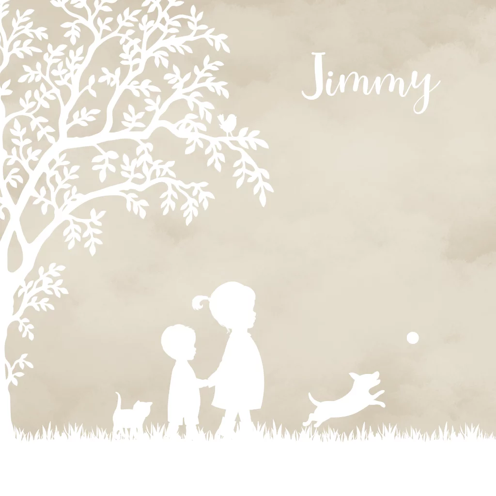 Geboortekaartje voor een broertje met watercolor achtergrond en op de voorzijde een silhouet van een boom, grote zus met kleine broer en spelende kat en hond.
