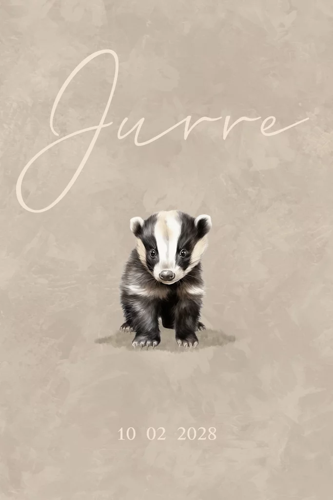 Een stoer en lieflijke geboortekaartje voor een zoon. De prachtige bruingrijze achtergrond met een subtiele structuur vormt een stoere basis voor dit minimalistische ontwerp. De illustratie van een schattige das maakt het kaartje heel speels. De naam van jullie kindje