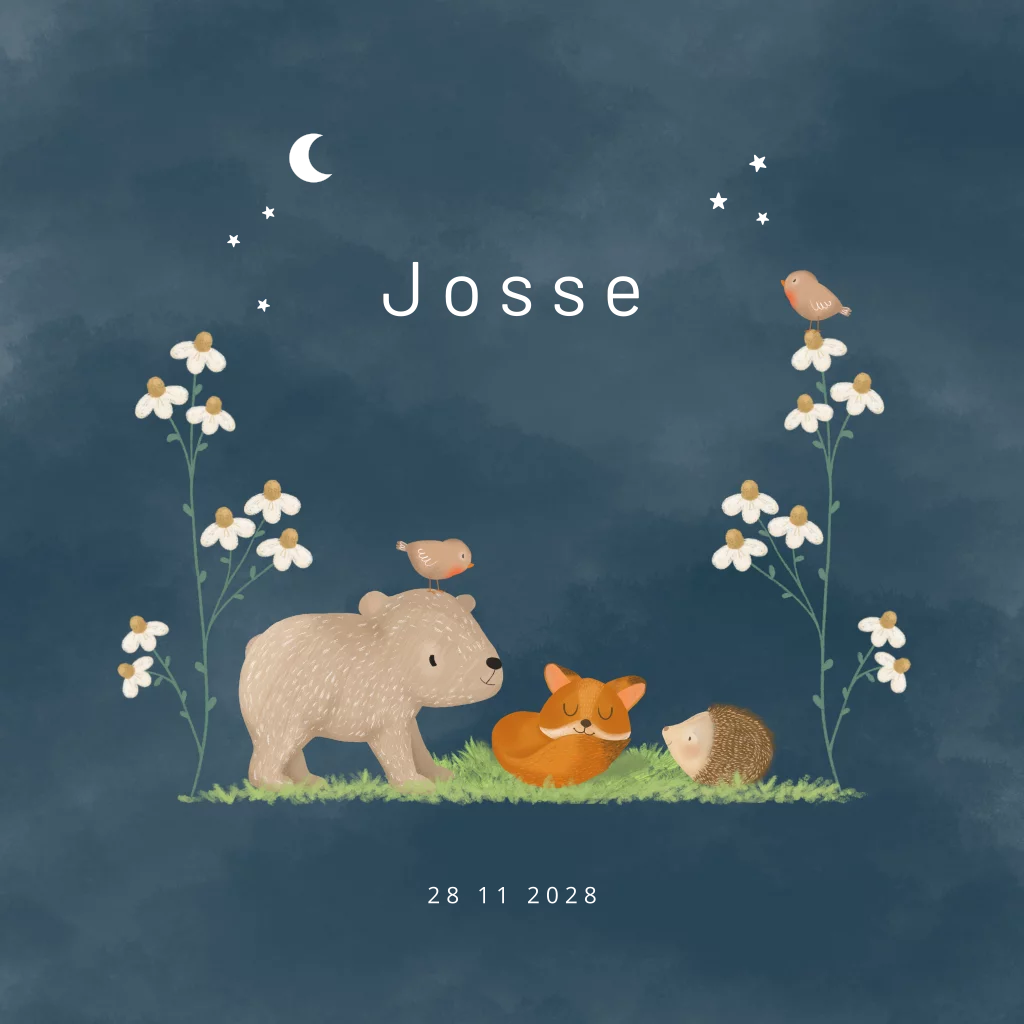 Te lief geboortekaartje met een slapend vosje die omringd wordt door een beertje, egeltje en vogeltjes. De naam, de sterretjes en de maan zijn uitgevoerd in goudfolie voor een extra sprankelend effect! - Josse -