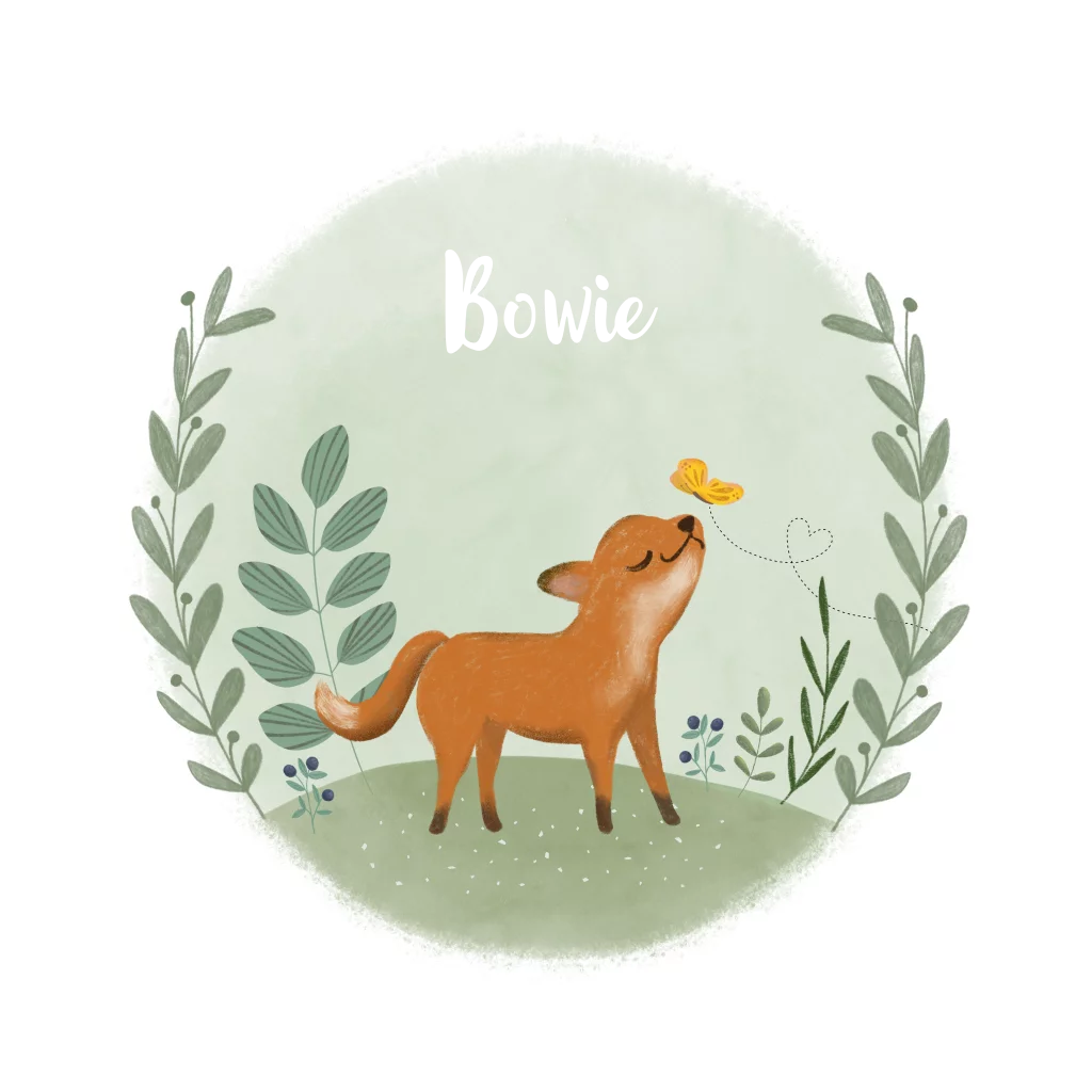 Lief geboortekaartje voor een zoon met een mooie illustratie van een vosje omringd door groen. Een gele vlinder landt op het neusje van de vos. De naam en de hartjes zijn in goudfolie. Dit kaartje is samengesteld uit losse illustraties die je zelf via de editor makkelijk kunt verplaatsen, verwijderen of juist toevoegen. - Bowie -