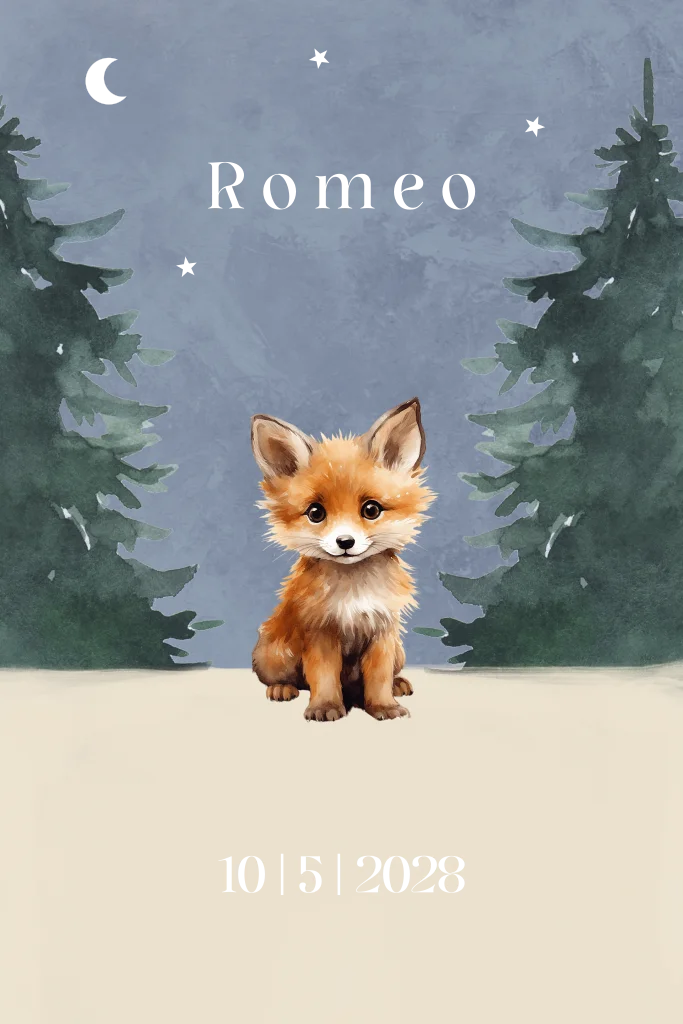 Geboortekaartje voor een zoon, met winters tafereel met dennenbomen en een lief vosje. De naam, sterretjes en maan in goudfolie geven dit kaartje een sprankelende uitstraling! - Romeo -
