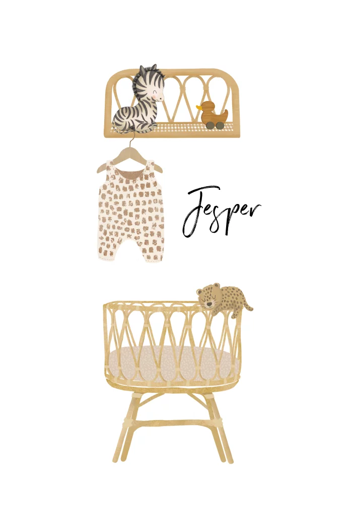 Hip geboortekaartje voor een jongen met trendy rotan wiegje en wandrekje, leuke knuffels van jungledieren en een stoer babypakje met print.
