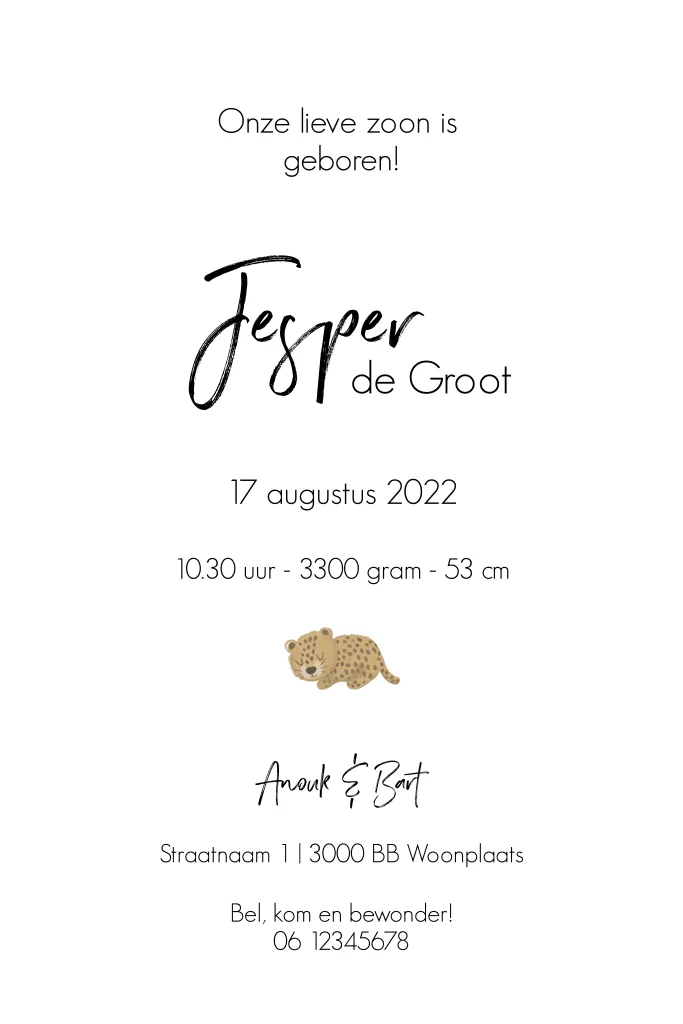 Op de binnenzijde van de kaart komt het babypakje en het slapende luipaardje weer terug. Natuurlijk is dit kaartje helemaal naar wens aan te passen via de editor. En als je hier niet helemaal uit komt, dan kun je gewoon even contact opnemen, dan helpen we je graag! - Jesper -