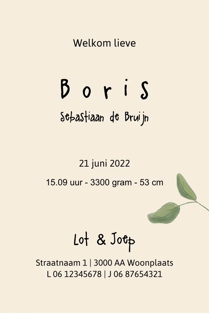 Geboortekaartje voor een jongen in junglethema. Zandkleurige achtergrond met op de voorgrond een neushoorn, zebra en luipaard omring door bladeren.