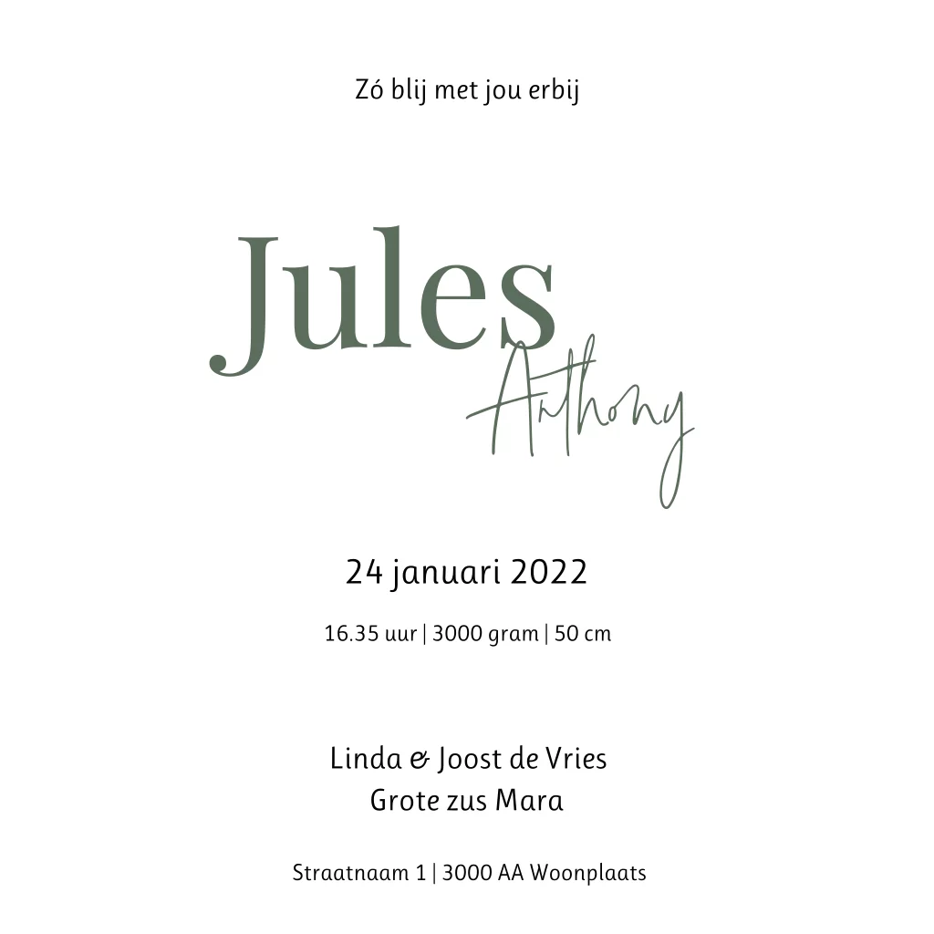 Rustig design met diep groene achtergrond en naam in mooi klassiek lettertype.