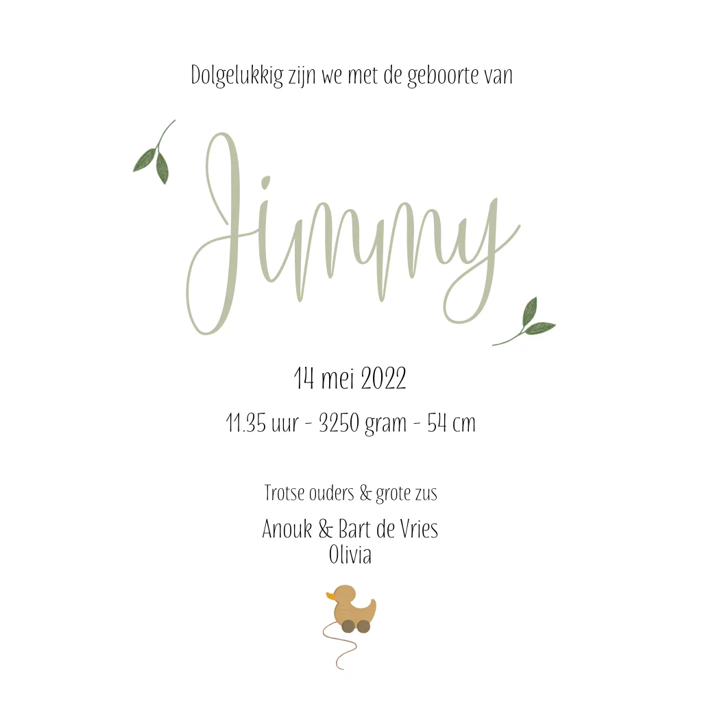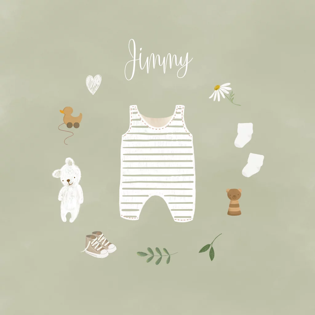 Lief geboortekaartje voor een jongen, met mooie vergrijsde groentint en handgetekende illustraties van babykleertjes en speeltjes. De takjes zorgen voor nog wat extra kleurcontrast. De illustraties zijn allemaal afzonderlijk van elkaar te verplaatsen of weg te halen, zo kun je het kaartje helemaal eigen maken. Heb je hier hulp bij nodig? Geen probleem, gewoon even een berichtje sturen en we helpen je graag! - Jimmy -
