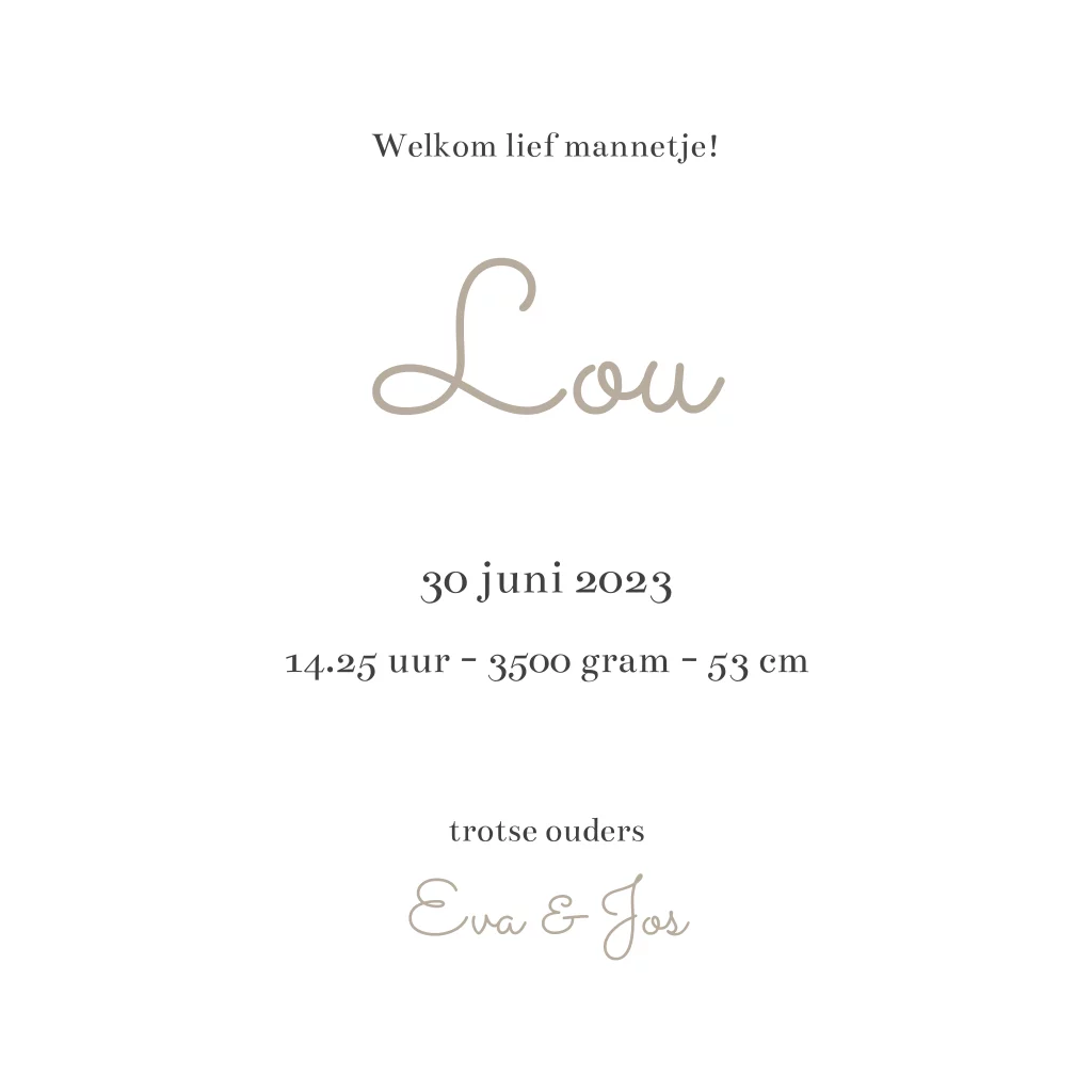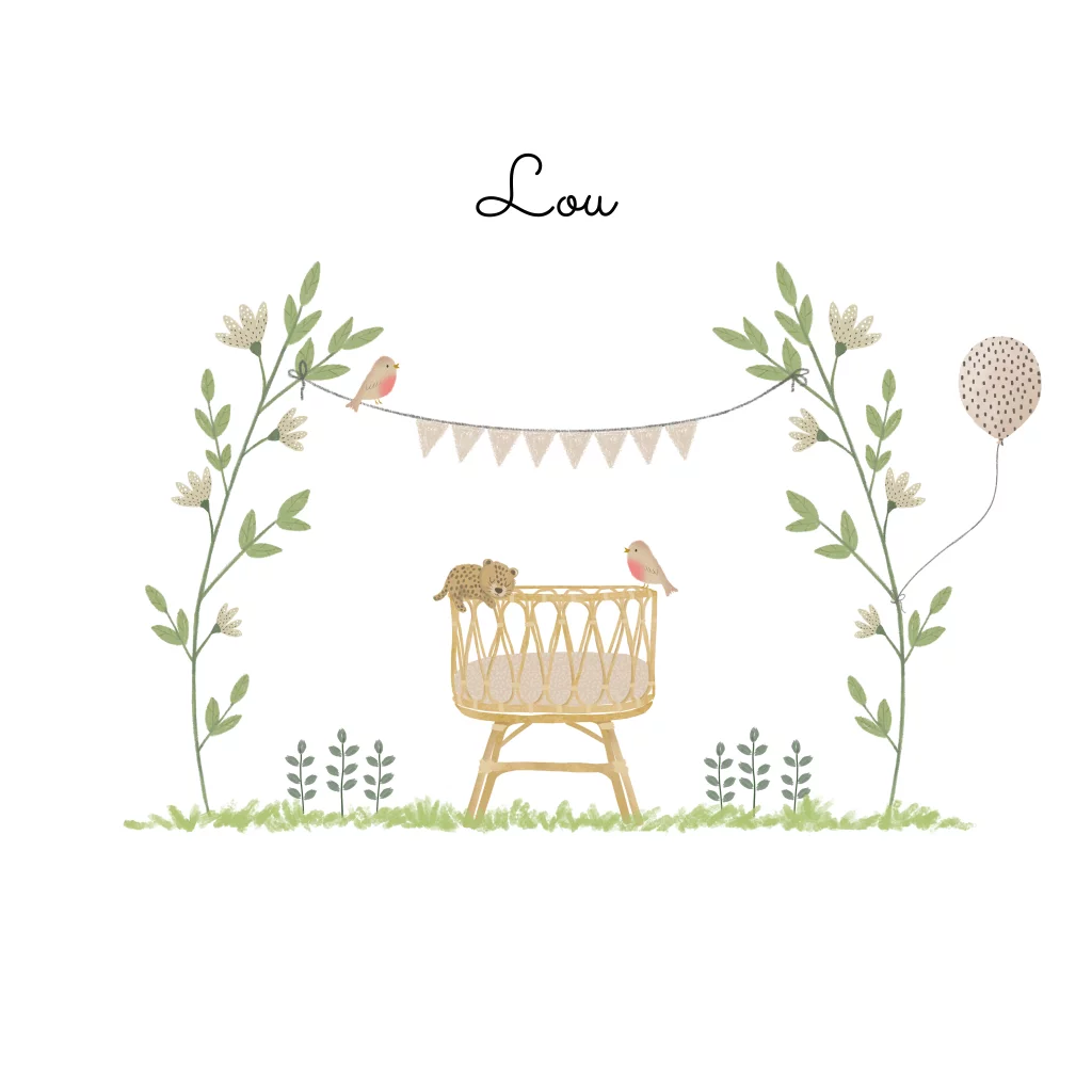 Lief geboortekaartje voor een jongen met rotan wiegje met slapend pantertje, bloementakjes en vogeltjes. Een vlaggetjes slinger en ballon geven dit kaartje een feestelijk accentje! Dit kaartje is samengesteld uit losse elementen, dus je kunt het helemaal naar eigen smaak aanpassen! - Lou -