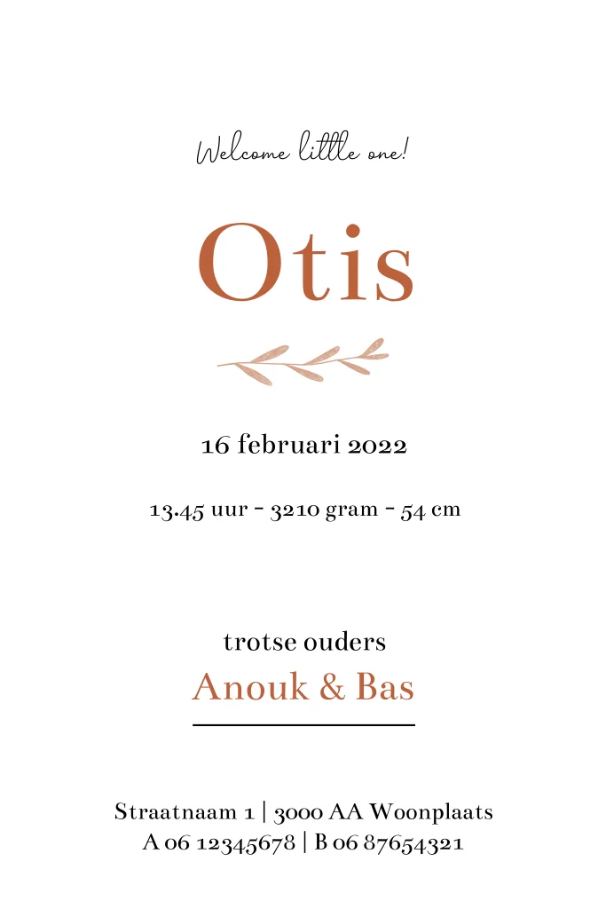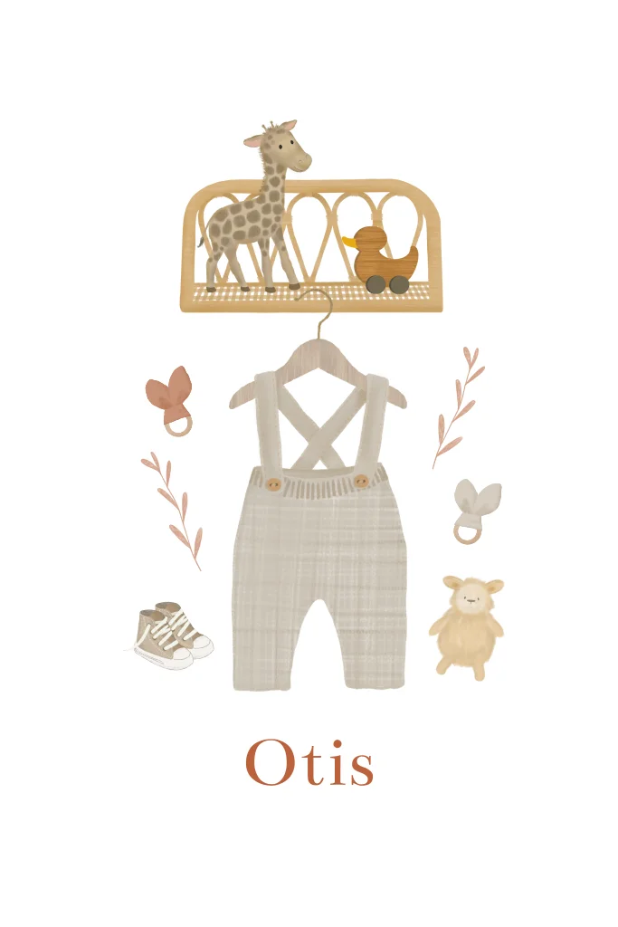 Lief geboortekaartje voor een jongen met illustratie van een rotan wandrekje met daaraan een lief geruit tuinbroekje. Op het rekje een knuffeltje en een houten speelgoed eendje. Om het pakje heen illustraties van takjes, bijtringen en stoere sneakertjes. Alle illustraties zijn afzonderlijk te verplaatsen zodat je het kaartje helemaal naar eigen wens in kunt delen.