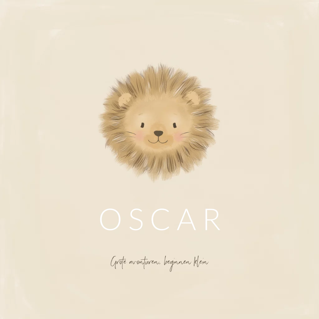 Wat een lief geboortekaartje is dit! Mooie zandkleurige watercolour achtergrond met daarop een schattig leeuwenkopje. Op zowel de voor- als achterzijde zijn de namen in goudfolie gedrukt. De ronde hoeken geven dit kaartje een zachtere uitstraling. Wil je dit kaartje op een ander formaat? Stuur dan even een berichtje, dan passen we dit graag voor je aan! - Oscar -