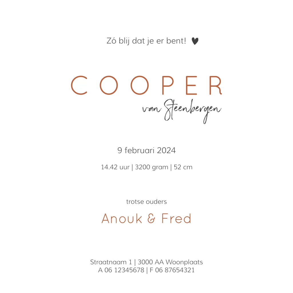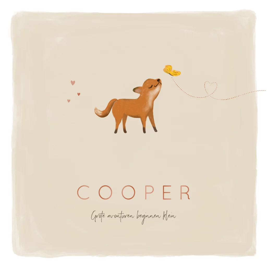 Superlief geboortekaartje met illustratie van een vosje en een vlindertje. De naam en hartjes in hoogglans komen prachtig uit op de watercolour zandkleurige achtergrond. - Cooper -