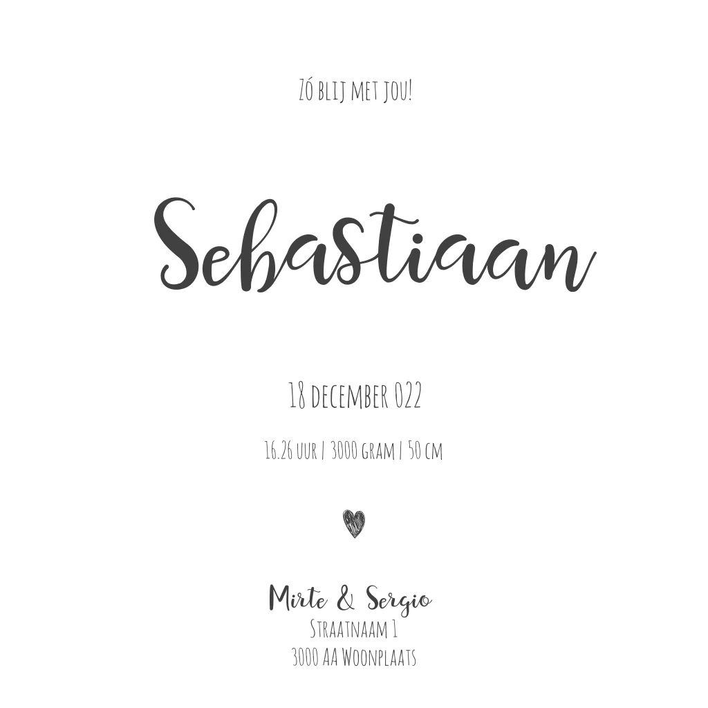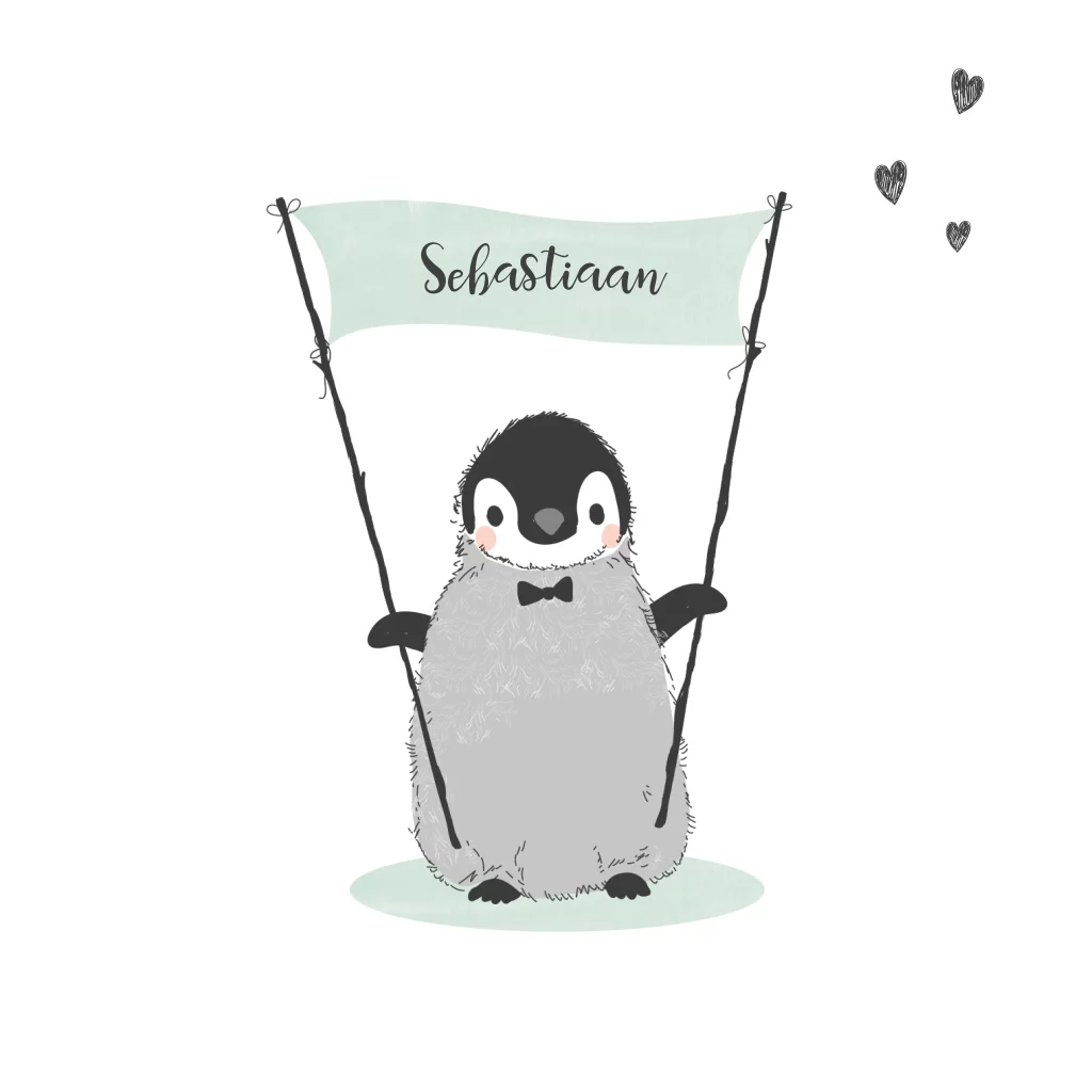 Lief jongens geboortekaartje met pinguïn met spandoek waar de naam van jullie kindje in staat. Leuk detail zijn de kleine sprankelende hartjes die met de hand getekend zijn. Voor de opmaak van de tekst aan de binnenzijde is gebruik gemaakt van een sierlijk en een 'handwriting' lettertype voor een speels effect.