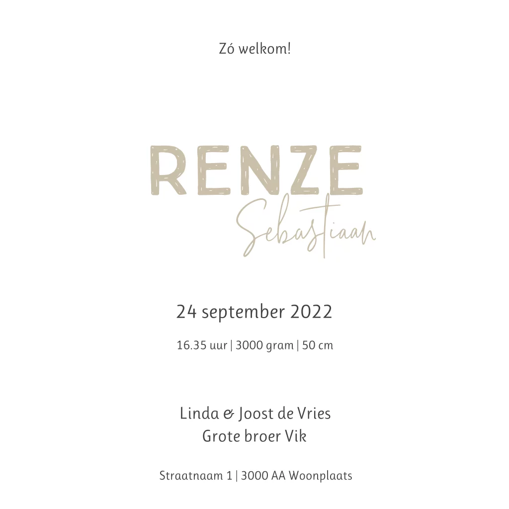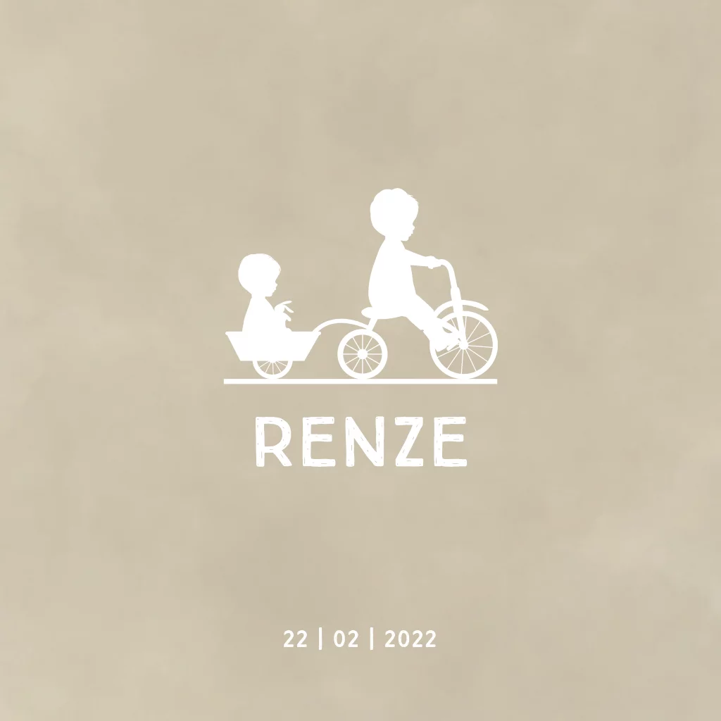 Rustig minimalistisch geboortekaartje met zandkleurige achtergrond en daarop een silhouet van grote broer en kleine broer. Grote broer op een fietsje en de kleine spruit in een aanhangwagentje er achteraan!