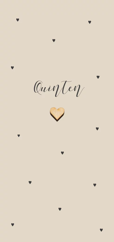 Zandkleurige achtergrond met kleine donkergrijze hartjes en een hartje van echt hout. De kleuren en fonts zijn via de editor eenvoudig aan te passen.