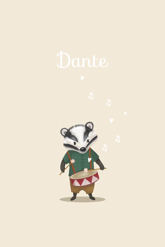 Schattig geboortekaartje voor een jongen met illustratie van een kleine wasbeer met een trommel. De naam en de muzieknootjes in goudfolie maken echt een feestje van dit lieve kaartje. - Dante -
