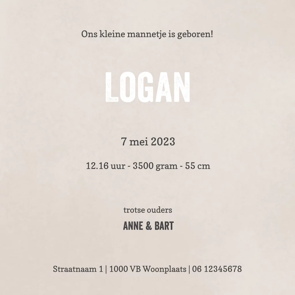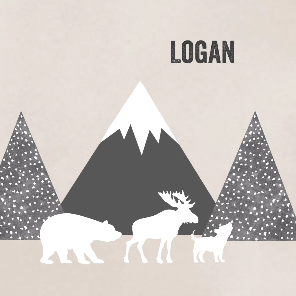Stoer geboortekaartje voor een jongen in rustige kleuren, met berglandschap en bosdieren. De bosdieren komen aan de binnenzijde van het kaartje ook terug. Het stoere lettertype wat we voor dit kaartje hebben gekozen maakt de stoere look compleet! Natuurlijk kun je dit kaartje zelf helemaal naar eigen smaak aanpassen! - Logan -