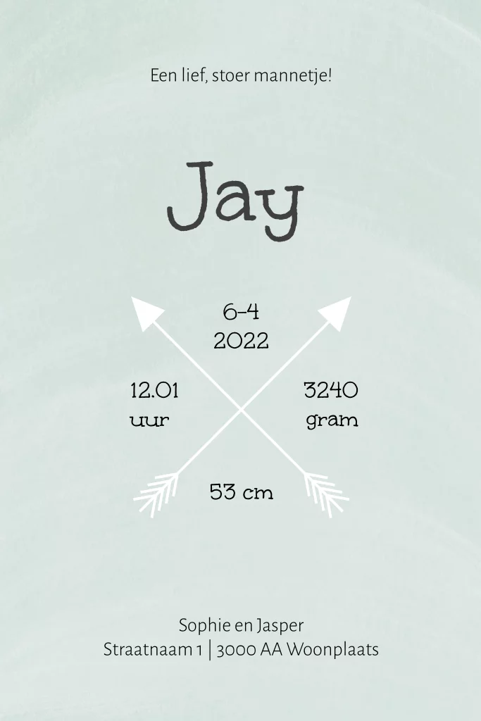 Geboortekaartje met stoere uitstraling: groene watercolour achtergrond met silhouet van kleine indiaan met knuffelbeertje. De naam van jullie kleine spruit wordt weergegeven tussen twee pijlen. De sprankelende hartjes geven dit kaartje een vrolijke 'touch'.