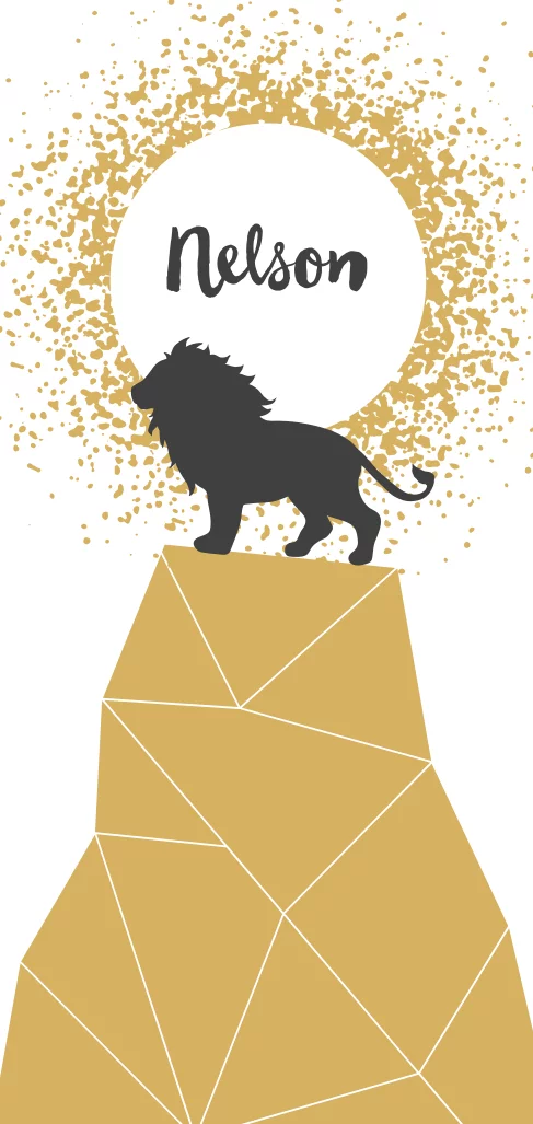 Stoer silhouet geboortekaartje voor een jongen met silhouet van leeuw boven op een berg. De kleuren combinatie okergeel met zwart geeft dit ontwerp een frisse en stoere uitstraling. Natuurlijk zijn de kleuren helemaal naar eigen smaak aan te passen.