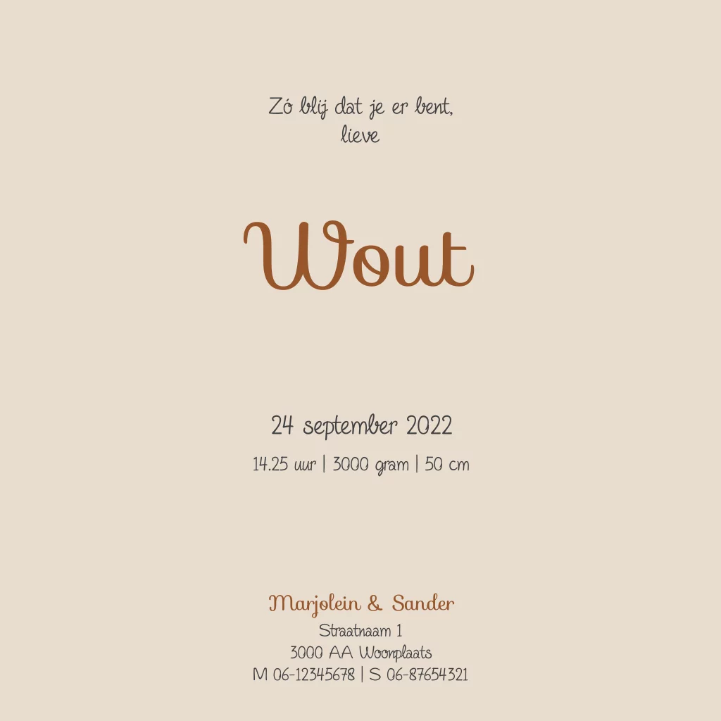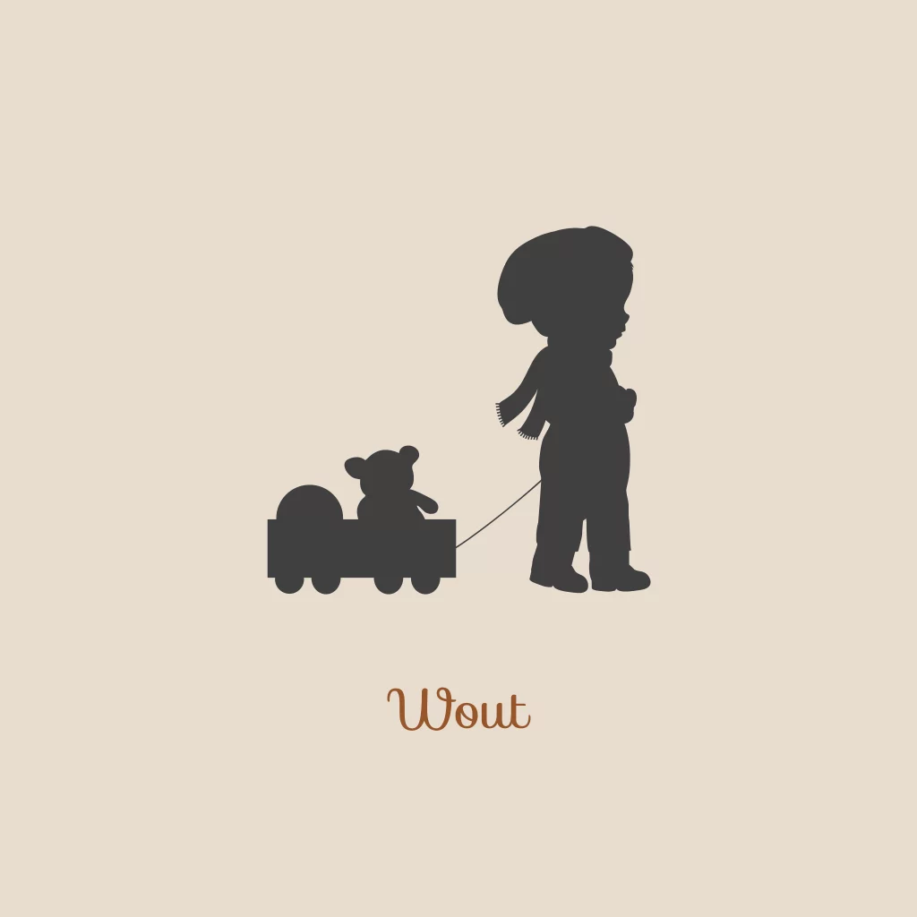 Silhouet geboortekaartje voor een jongen in trendy kleurstelling zandkleur, terra en zwart. Stoere illustratie van silhouet van jongen met hip mutsje en wagentje met daarin een bal en een knuffelbeer.