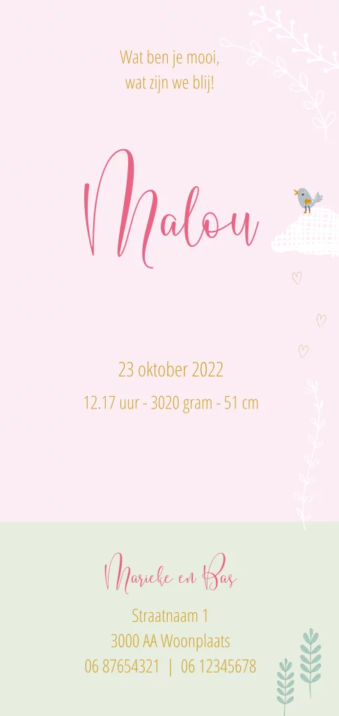 De geboorte van jullie dochter is natuurlijk een feestelijke gebeurtenis! Dit geboortekaartje staat helemaal in het teken van feest! Vrolijke dieren, verschillende takjes, wolken en sprankelende hartjes. In één van de wolkjes is ruimte voor de naam van jullie kindje.