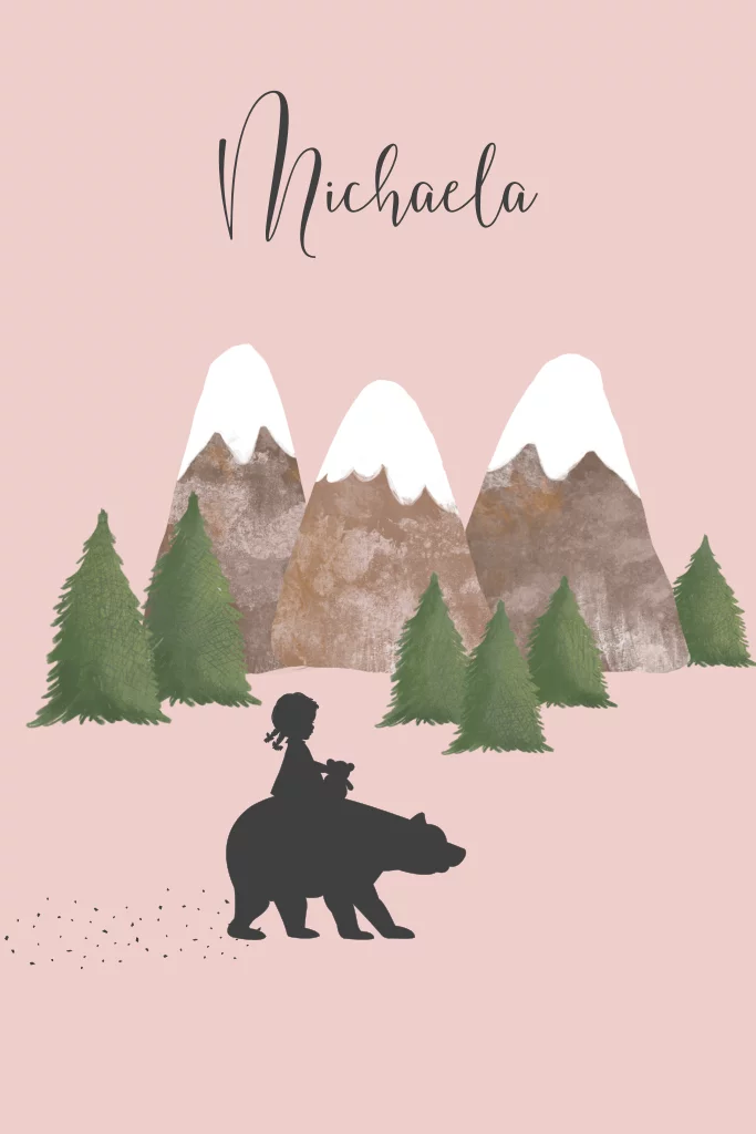 Stoer geboortekaartje voor een meisje! Op de achtergrond bergen en dennenbomen en op de voorgrond een silhouet van een klein meisje op de rug van een beer.