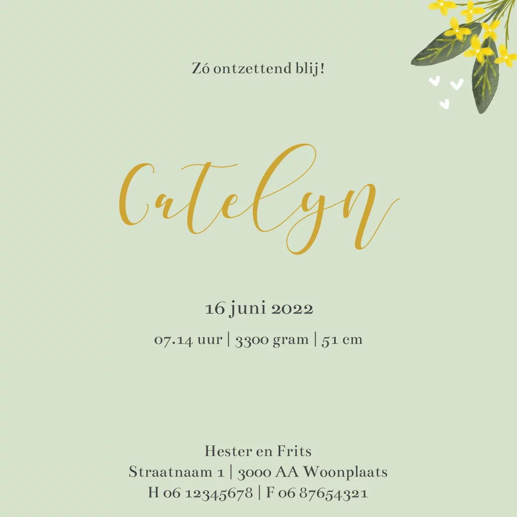 Prachtig geboortekaartje voor een meisje met bloemen en bladeren. Dit ontwerp sluit helemaal aan bij de huidige botanische trend. De naam van jouw kindje in een mooi lettertype maakt dit ontwerp compleet!