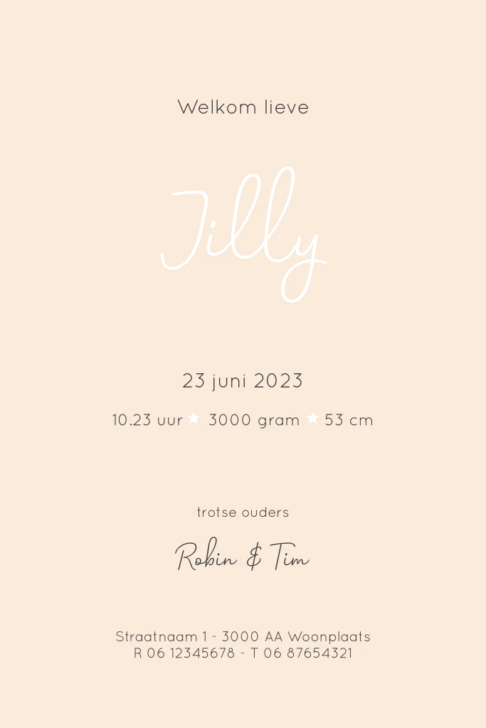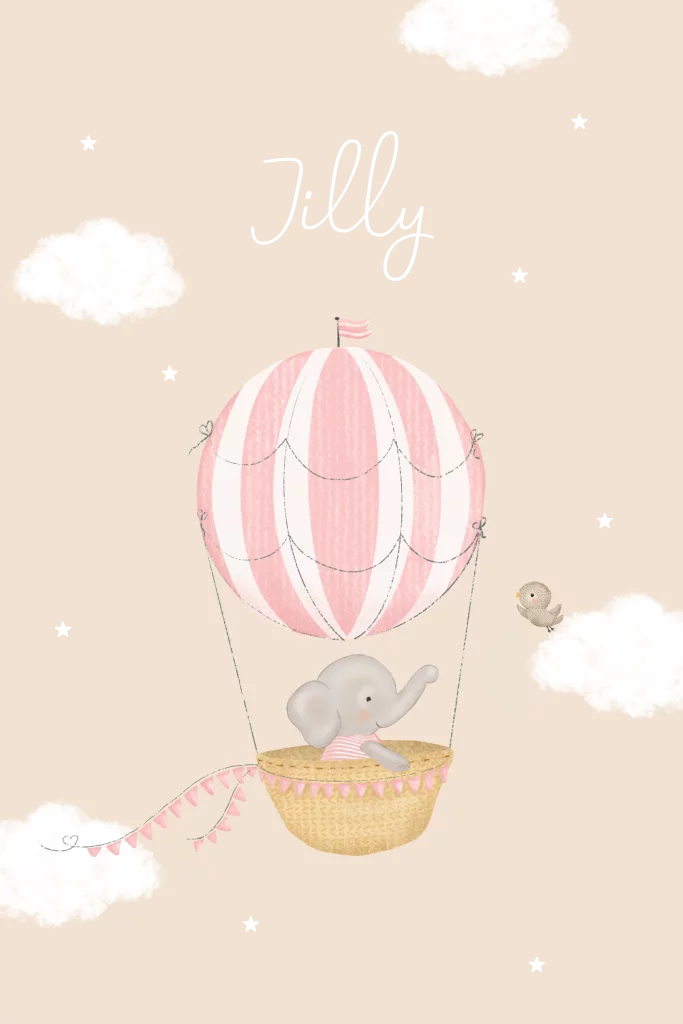 Lief geboortekaartje voor een dochter met een olifantje in een luchtballon. Naturel achtergrond met wolkjes en sprankelende goudfolie sterretjes. Ook de naam is in goudfolie. Natuurlijk kun je ook voor een andere kleur folie kiezen. - Jilly -
