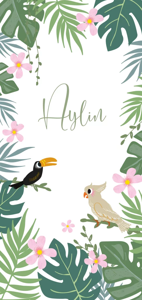 Vrolijk geboortekaartje in junglethema voor een meisje. Tussen de tropische bladeren en bloemen zitten twee grappige papegaaien. De naam in mooi lettertype. op de achterzijde komen de bladeren en bloemen ook terug.