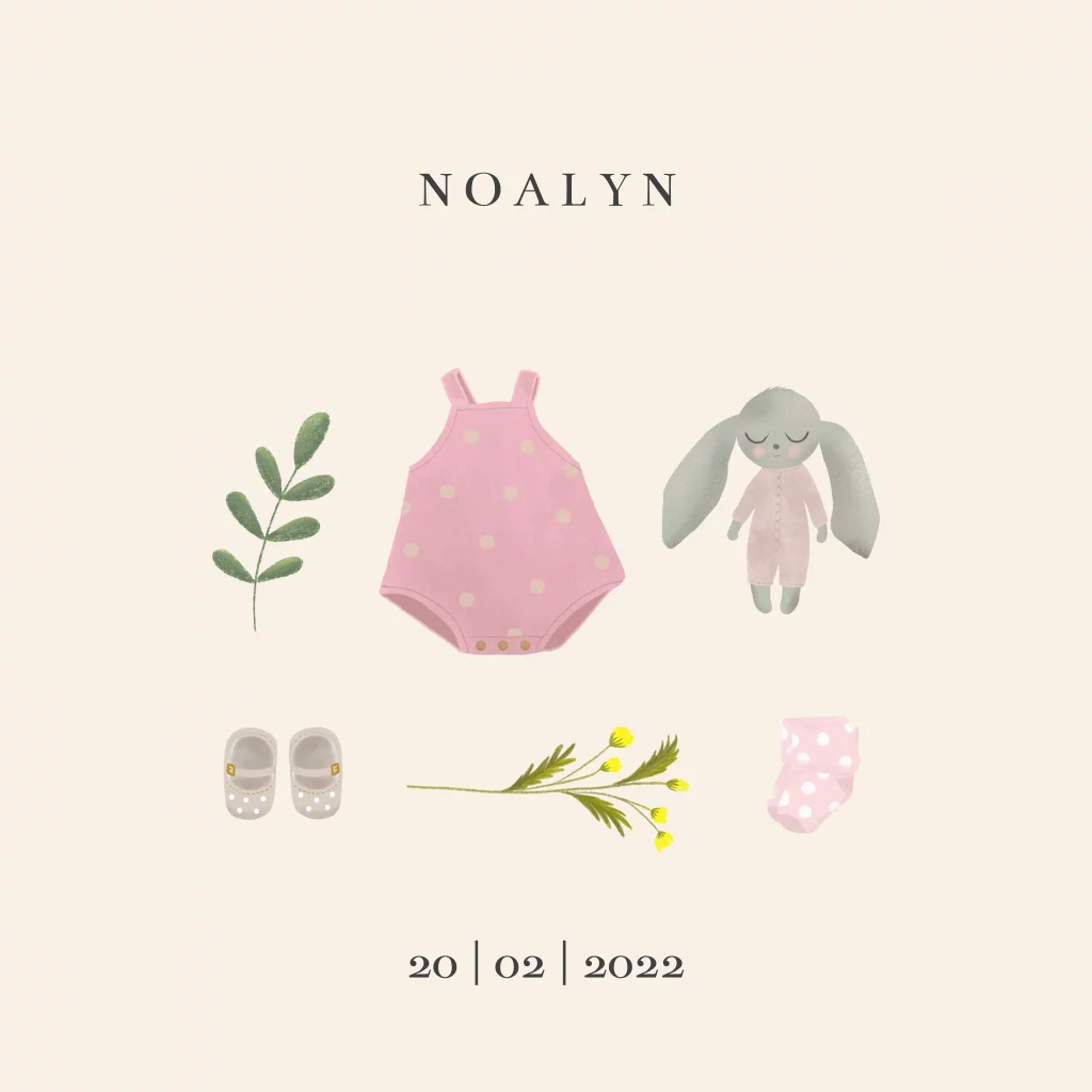 Dit klassieke geboortekaartje voor een meisje is superlief! Een schattig roze babypakje met stipjes, knuffelkonijntje en lieve babysokjes en -schoentjes.