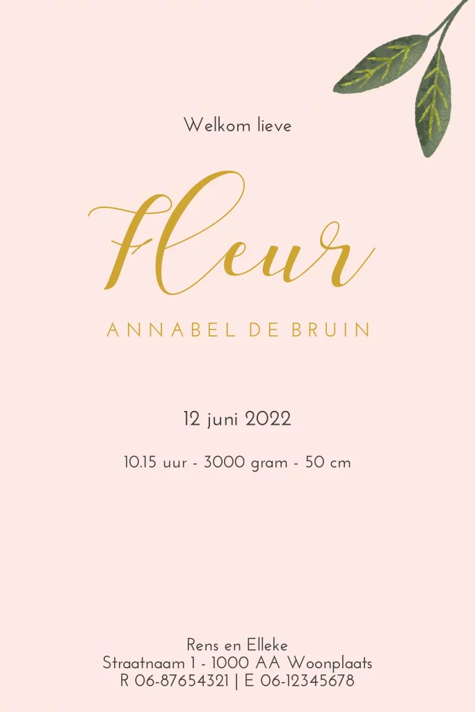 Wat een lief kaartje voor een meisje! Prachtige botanische illustratie van gele bloemen en groene bladeren op een zachtroze achtergrond.