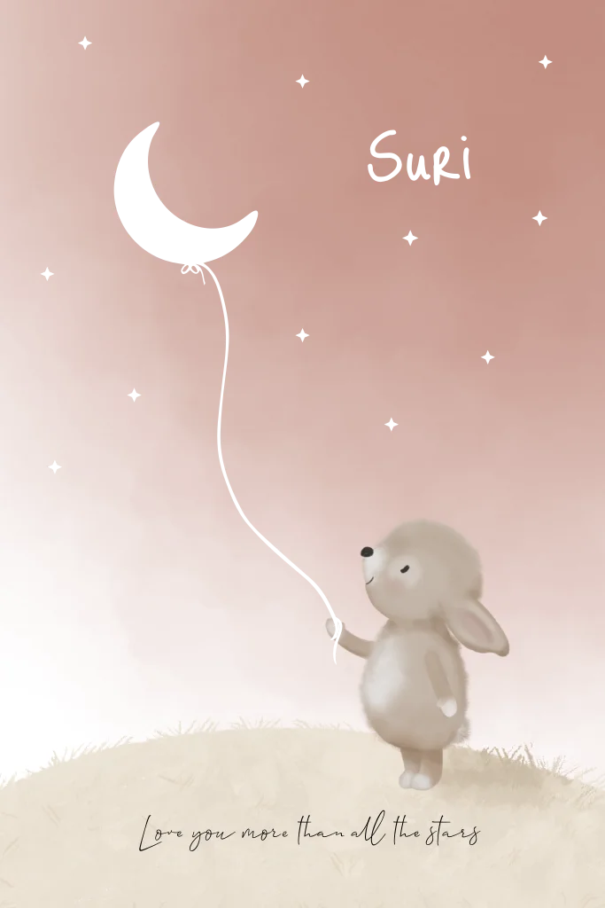 Lief geboortekaartje voor een meisje met illustratie van een konijntje en de maan. De naam, de sterretjes en de maan zijn uitgevoerd in roséfolie voor een sprankelend effect! - Suri -