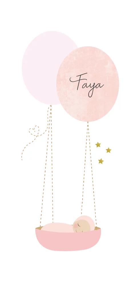 Een mandje met slapend kindje aan twee pastelkleurige ballonnen.