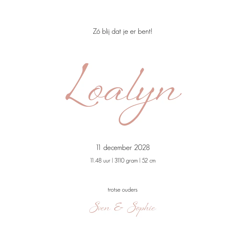 Minimalistisch geboortekaartje met zachtroze linnenlook achtergrond. Hier komt de naam in goudfolie prachtig tot zijn recht!