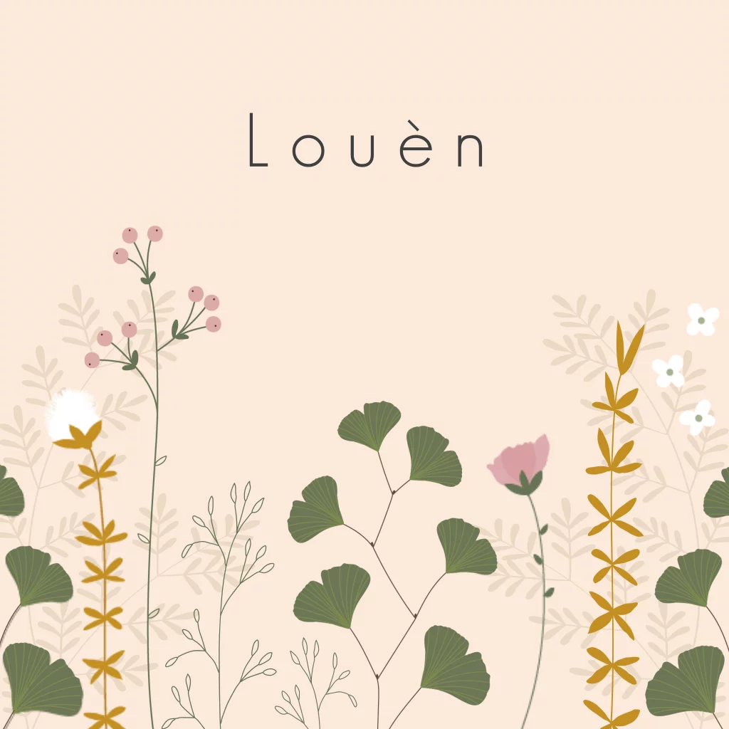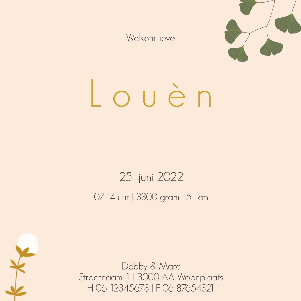 Origineel geboortekaartje voor een meisje samengesteld uit verschillende veldbloemen en takjes.