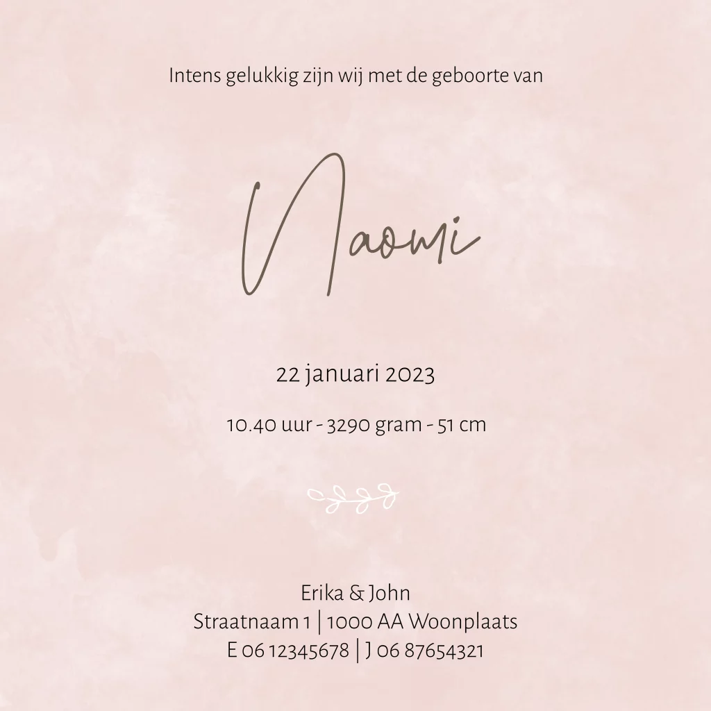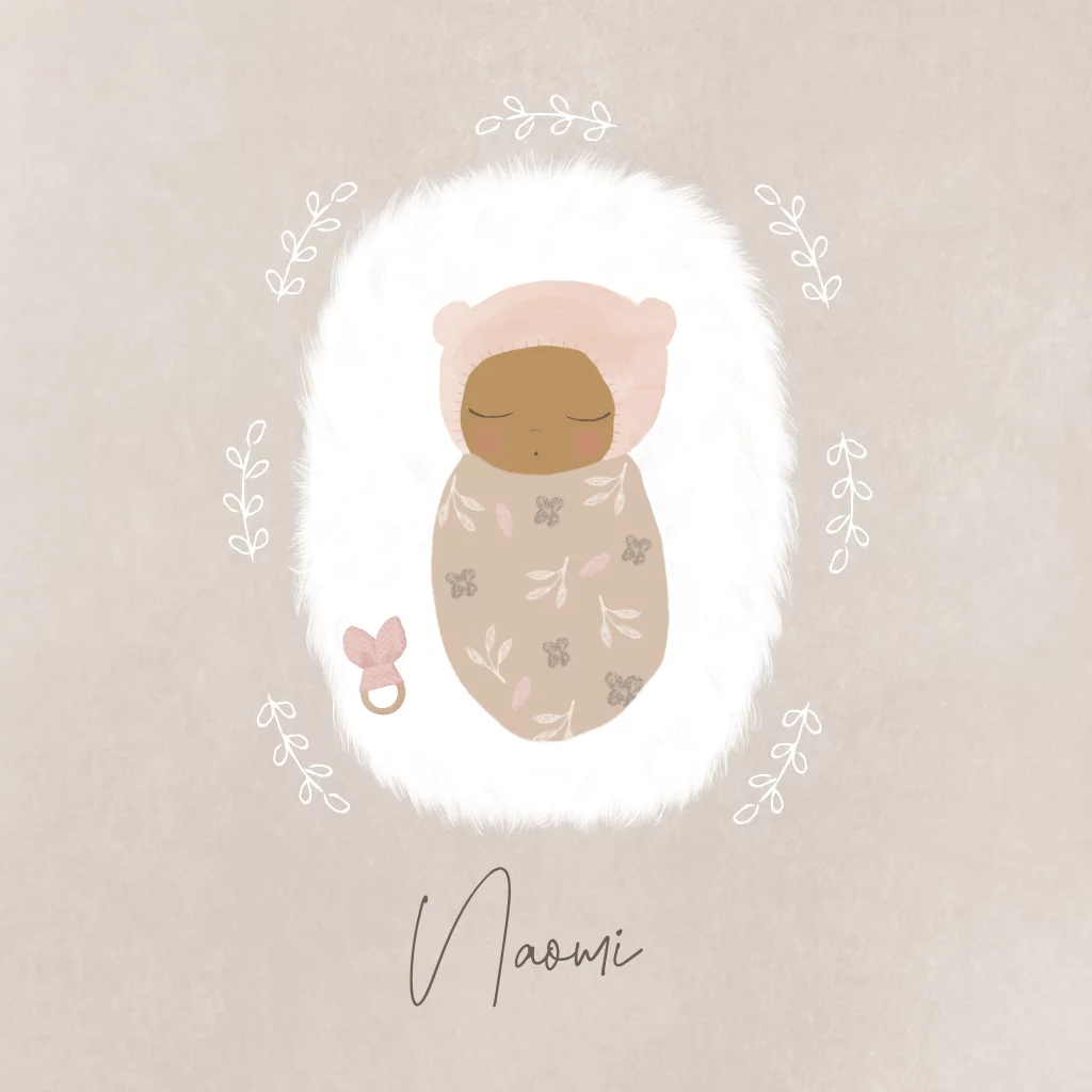 Lief en dromerig geboortekaartje voor een meisje met een slapende ingebakerde baby op een schapenvacht. Leuke accentjes zijn de takjes en de bijtring. Dit kaartje is helemaal naar wens aan te passen. In de beeldbank vind je ook meer varianten van het babietje.