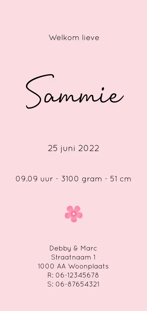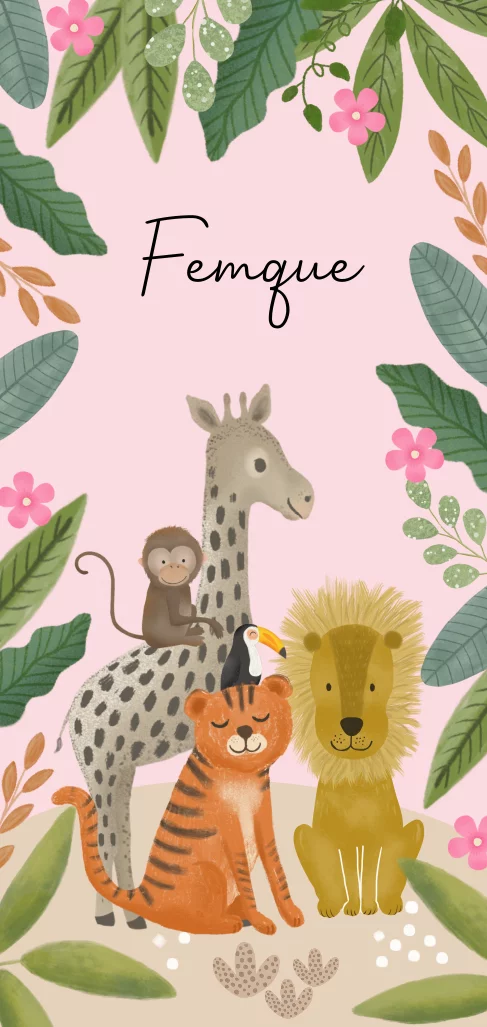 Een stoer en vrolijk geboortekaartje voor een meisje! Een bonte verzameling dieren uit de jungle, omringd door tropische bladeren. De roze achtergrond en de felroze tropische bloemen geven dit kaartje een meisjesachtige look. Vind je het toch te zoet? Dan kun je de bloemetjes weghalen en de achtergrondkleur aanpassen naar een kleur die jij mooi vindt! - Femque -