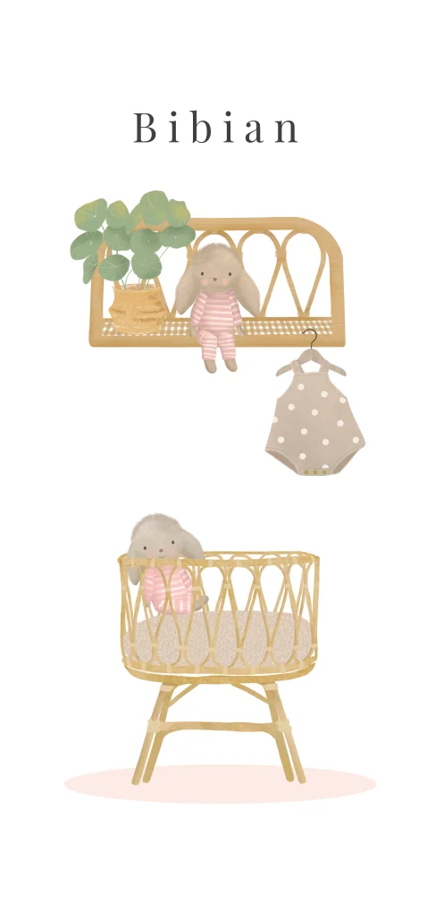 Superlief geboortekaartje voor een meisje, met rotan wiegje met daarin een knuffel konijntje. Daarboven een rotan wandrekje met een plant en knuffel en een lief babypakje.Op de achterzijde komt ook een klein konijntje terug.