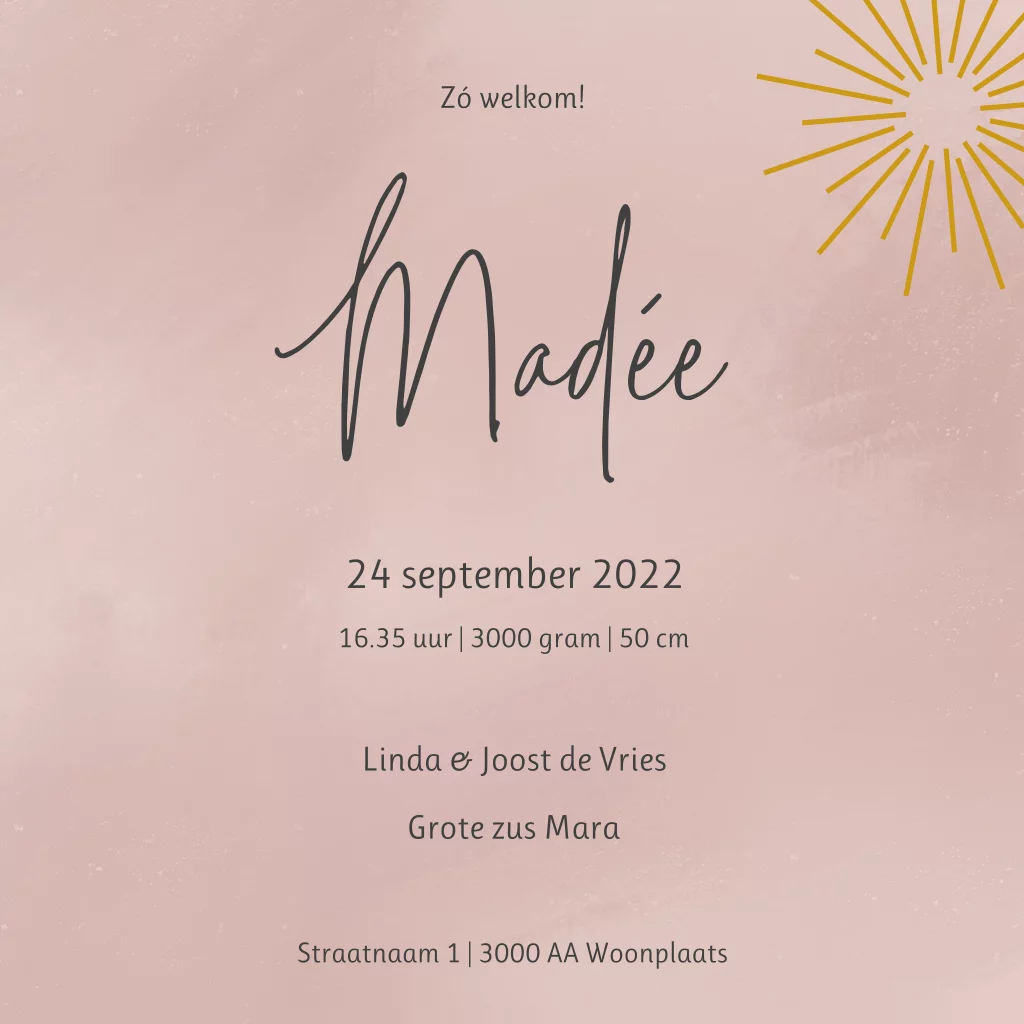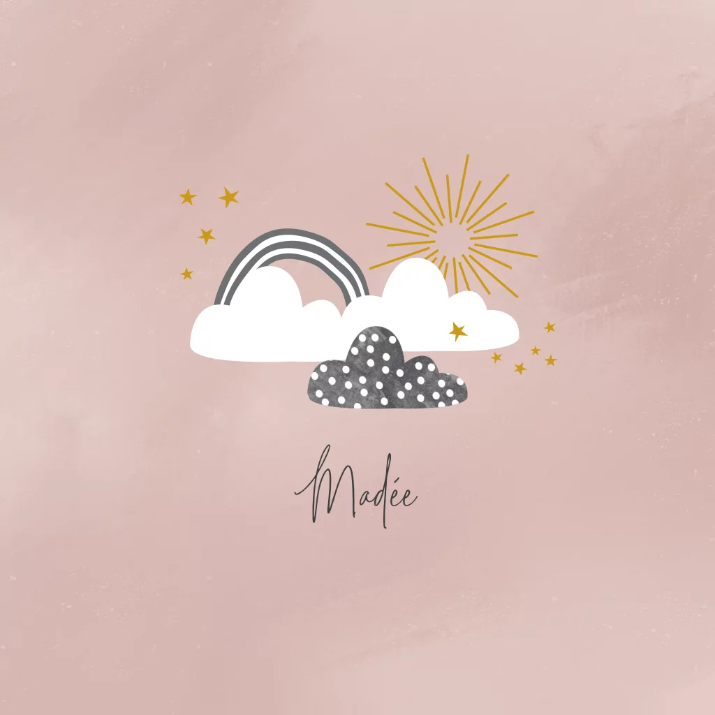 Origineel geboortekaartje voor een meisje. Oudroze watercolouer achtergrond en op de voorgrond wolkjes, een regenboog en een stralende zon. De sprankelende sterretjes geven dit kaartje nét die vrolijke noot!