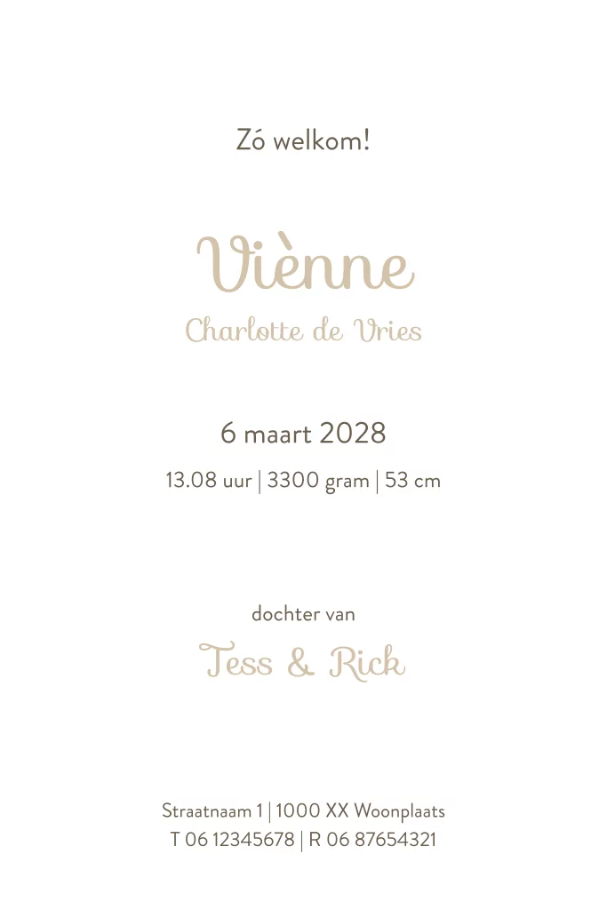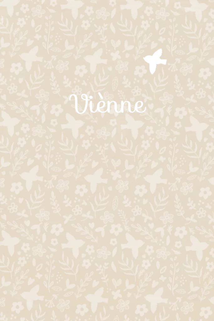 Lief geboortekaartje voor een meisje met patroon van bloemetjes, takjes en vogeltjes op een zandkleurige achtergrond. De goudfolie elementjes maken er en fleurig en sprankelend geheel van. - Viènne -
