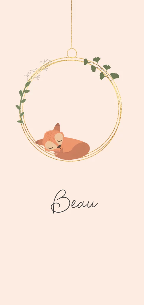 Wat een lief geboortekaartje voor een meisje! Goudkleurige ringen met daarin een lief slapend vosje. De takjes maken dit ontwerp compleet. Op de achterzijde komen de goudkleurige ringen weer terug.